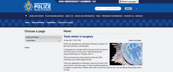 Meanwhile, police in Northumbria are appealing for witnesses following a burglary at Arcot Golf Club.