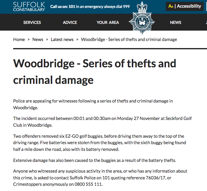 Just two days earlier Seckford Golf Club in Suffolk experienced a similar break-in, as two offenders removed the batteries from six golf buggies.