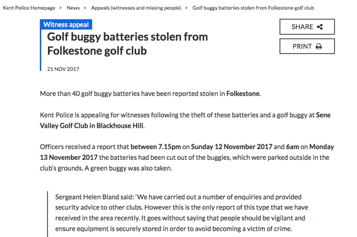 In Oxfordshire, the issue has become so serious that Thames Valley Police have issued a warning to all local golf clubs to be on the lookout for the theft of batteries from golf buggies.