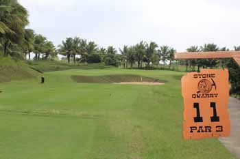 Stone Quarry golf course is a quirky feature of Mission Hills, with suspended train carriages part way up, broken rail tracks as the mining carriage are about to fly off the rails just at that moment the pause button has been pressed.