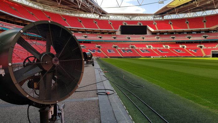 There are different types of turf fans and they have evolved considerably since they first started being used on sports fields. Caged, oscillating or turbo are the most common ones observed, oscillating being considered the most beneficial for turf care. They have been developed to provide smooth airflow across the turf canopy.