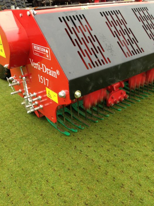 Lighter Verti-Drains, such as the 1513 or 1517 from Charterhouse, can be mounted behind a small compact tractor and deliver the results required to keep the surface free draining. It can also help to link up with the deeper aeration work done over the winter.