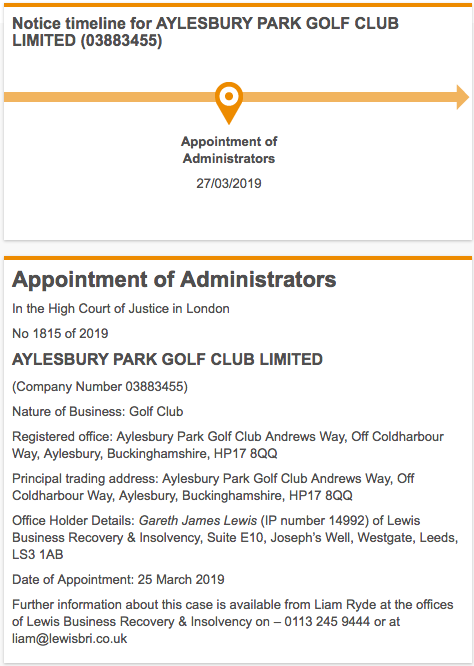 “[I] was appointed Administrator of Aylesbury Park Golf Club Limited (‘the Company’) on 25 March 2019.
