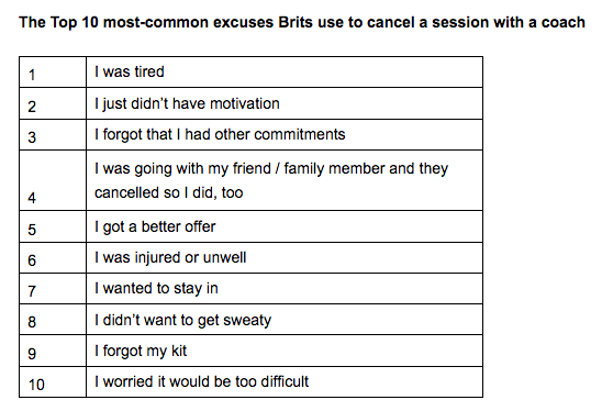 According to fibodo, which looked at coaches covering a range of sports including golf, clients’ top three excuses for failing to attend a pre-booked session include tiredness (62 per cent), lack of motivation (59 per cent) and forgetting other commitments (52 per cent).