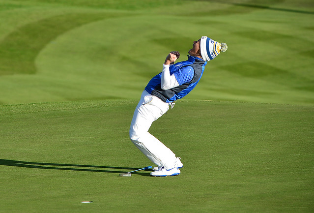 15/09/2019. Ladies European Tour 2019. The Solheim Cup, PGA Centenary Course, Gleneagles Hotel, Scotland. 13-15 September 2019. Suzann Pettersen of Norway reacts on the 18th green as she sinks her final putt to help Europe win the Solheim Cup. Credit: Mark Runnacles/LET