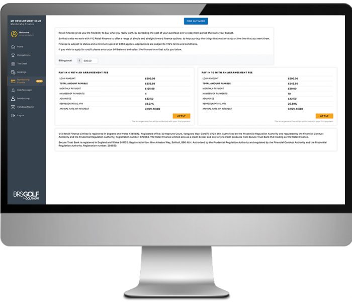 Free to golf clubs using our new members’ module, Membership Finance helps clubs retain and acquire golfers by making membership more affordable and accessible than ever. Our pioneering partnership with V12 Retail Finance allows golfers to apply for a loan to cover their membership online, directly through BRS GOLF.