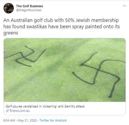 This comes a month after an Australian golf course, used predominantly by members of the Jewish community, also had a swastika sprayed into the ground.