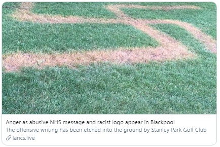 A golf club in Blackpool has found racist messages including a swastika, and abuse at the NHS, have been etched into the grass using weed killer, according to local reports.