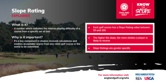 Knowing these two ratings allows the WHS to assess the difficulty of the course for all other levels and to produce a Slope Rating for each set of tees which allows golfers to work out how many strokes they will receive on any given course around the world – Course Handicap.