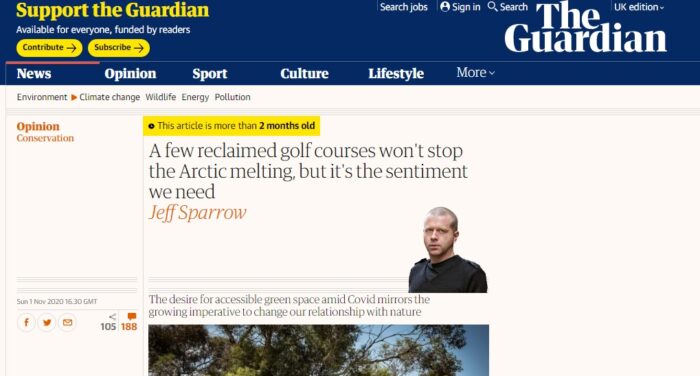 A comment piece appeared in The Guardian newspaper in November 2020, entitled: ‘A few reclaimed golf courses won’t stop the Arctic melting, but it’s the sentiment we need’. The argument was that golf courses ‘transform the native landscape into rolling greens’, which, stated the author, is bad for the environment because ‘publicly accessible green space [is] precisely the sentiment we need in the fight for climate action’.