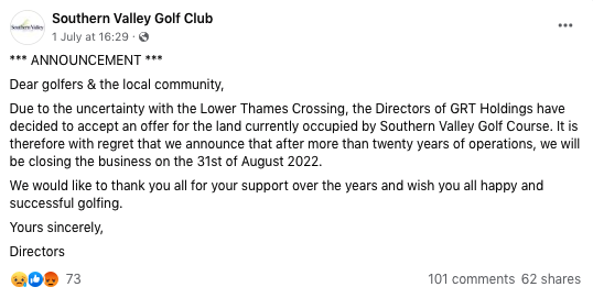 The Lower Thames Crossing is an £8.2 billion project that’s proposed to build across the land of Southern Valley Golf Club.