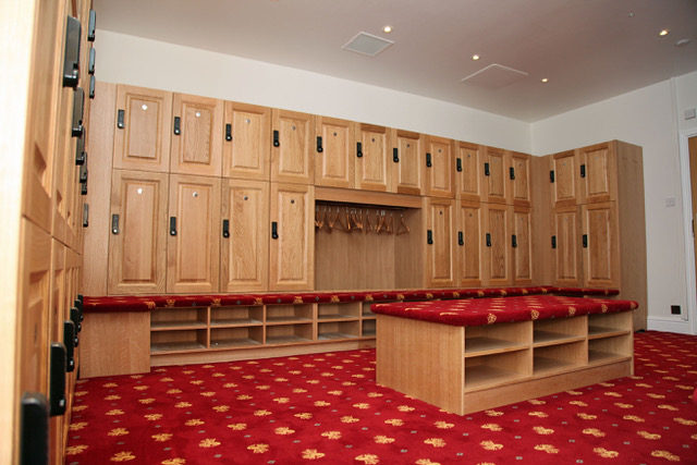 Light oak suit and holdall lockers plus hanging space blend with club logo-emblazoned warm red carpeting and upholstered integral benching to create an inviting, welcoming environment for visitors.