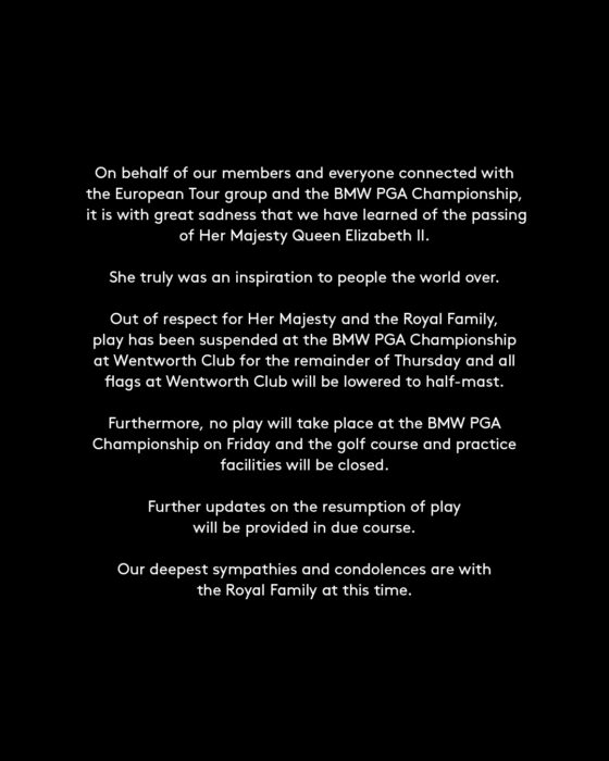 “On behalf of our members and everyone connected with the European Tour group and the BMW PGA Championship, it is with great sadness that we have learned of the passing of Her Majesty Queen Elizabeth II,” the DP World Tour said in a statement.