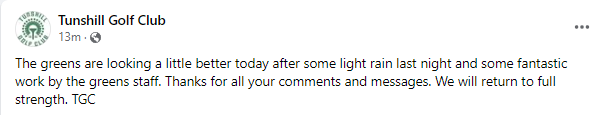 In an update the following day, the club posted: “The greens are looking a little better today after some light rain last night and some fantastic work by the greens staff. Thanks for all your comments and messages. We will return to full strength.”