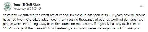 “Two people were seen riding away from the course on motorbikes. If anybody has any dash-cam or CCTV footage of them around 16.40 yesterday [Wednesday] could you please message the club. Thank you.”