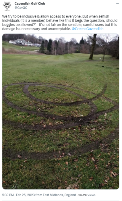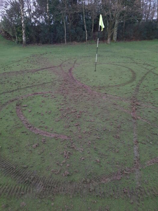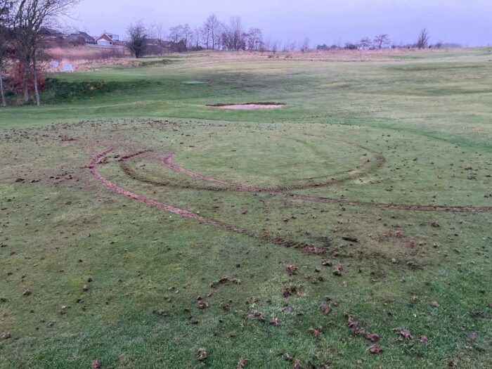 Meanwhile, Cavendish Golf Club in Derbyshire posted a picture of its course on Twitter, which had been damaged by a buggy. The club believes it happened on February 25 during a members’ competition. It is thought the area was wet and the buggy was driven around in circles.