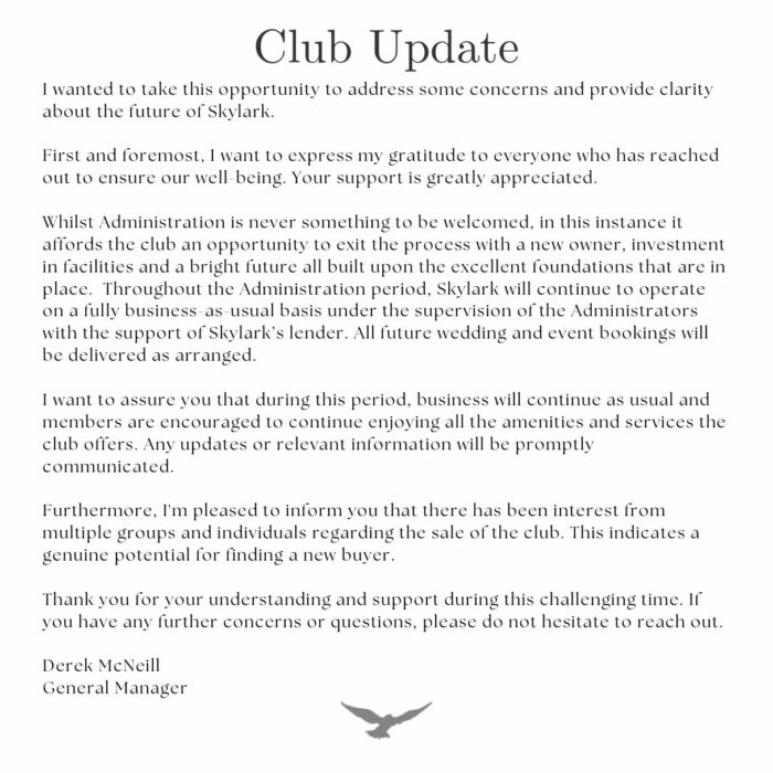 He said all future wedding and event bookings will still go ahead, with members being encouraged to still use the club. He added that there has been some initial buyer interest.