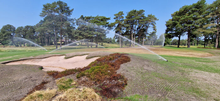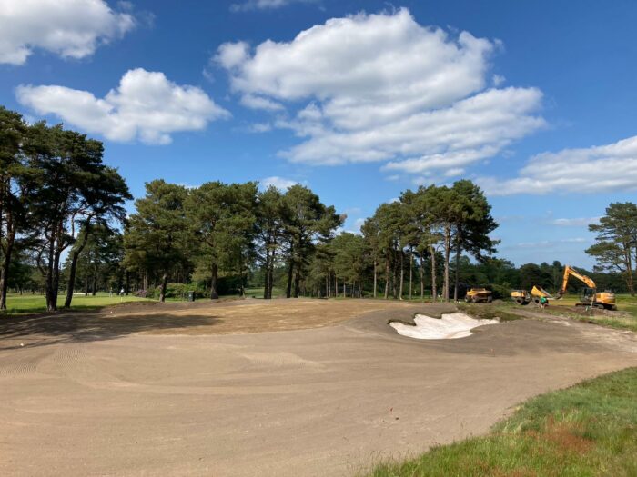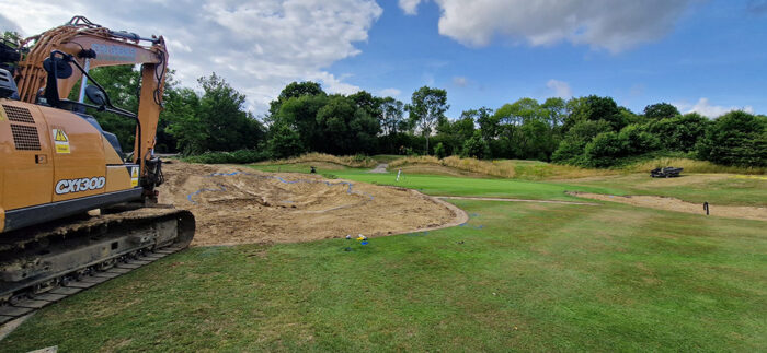 One of the largest is at Nizels GC in Kent where we are currently undertaking the second phase of both bunker reconstruction and fairway drainage. Phase one was completed during the summer of 2021 whereby both drainage and bunker reconstruction went in tandem, the advantage of this was to reduce the number of hole closures and minimise the use of temporary greens and tees. Another advantage of such a method is being able to use the excavated material from the drainage works as fill material for the bunkering. All bunkers on 18 holes and the extensive primary and secondary gravel banding drainage works will be completed by mid-September this year.