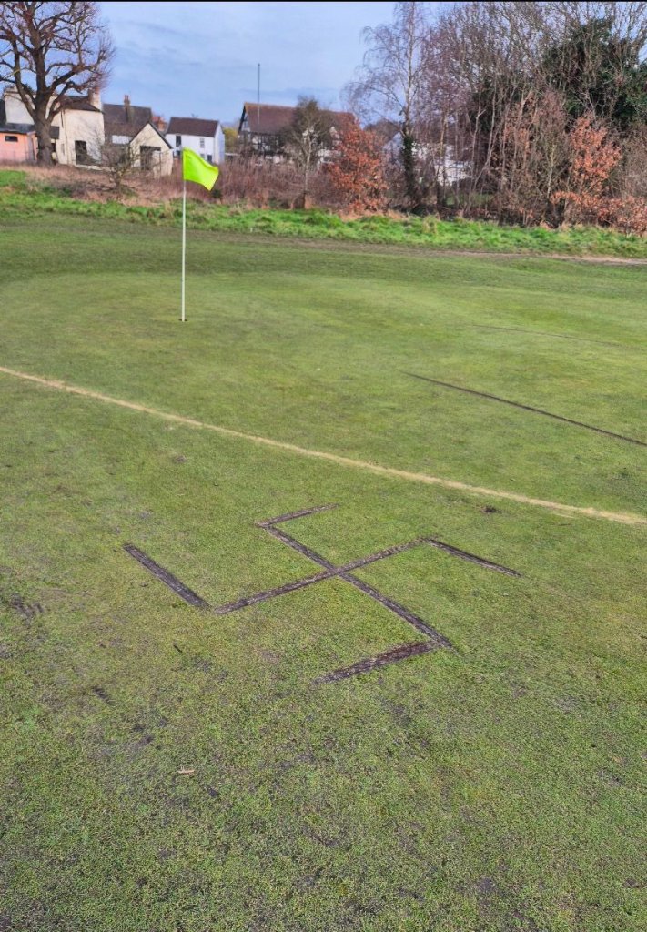 “It’s difficult this time of year. There’s not a whole lot you can do to fix the damage because the grass isn’t growing. We tried to cover up the Nazi symbol with some soil but the next day it was very visible.”