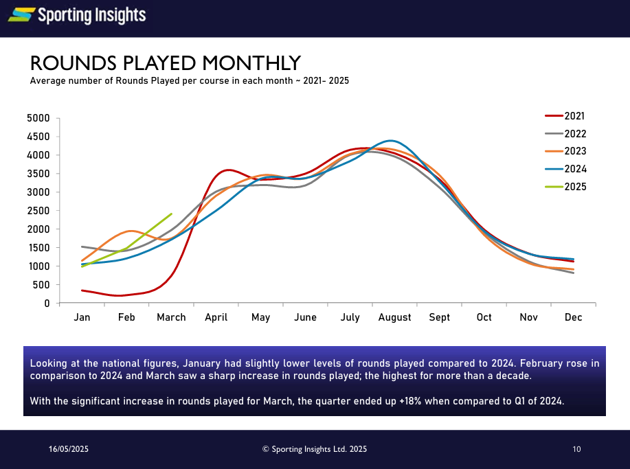 Sports research and data analytics company Sporting Insights has reported a strong end to the first quarter of 2025 for the number of rounds of golf played in Great Britain, with the company reporting a 41 percent uptick for the month of March against 2024’s figure.